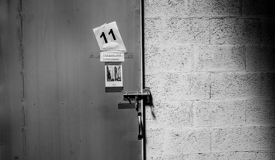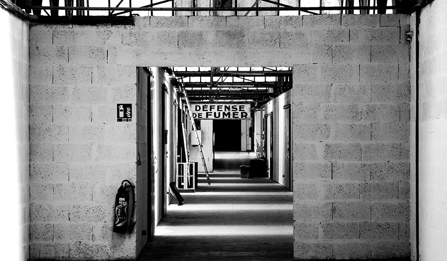 Nous décidons de nous dégourdir les jambes et nous arpentons les longs couloirs de l’usine, comme l’allée centrale d’une église, baignée de lumière divine, et chaque porte en fer recèle le trésor caché d’un artiste… Il y a des tronches qui se promènent, des mains et des joues qui se saluent… Mais on sent que chacun peut préserver son intimité si importante pour créer.